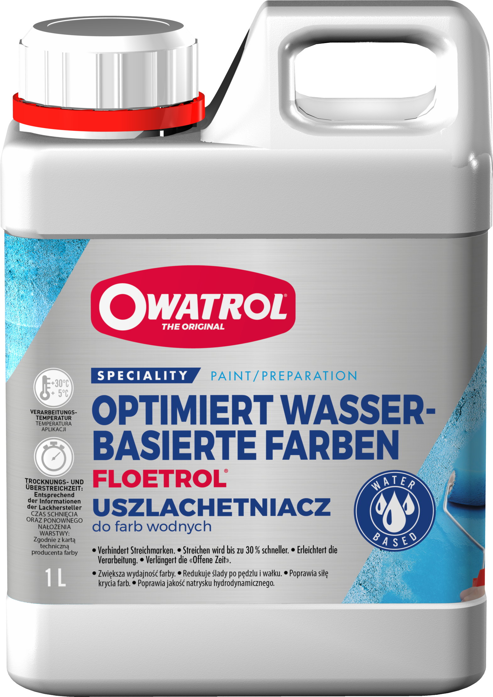 FLOETROL verbessert die Streicheigenschaften und den Verlauf von wasserbasierten Farben bei nicht optimalen Verarbeitungsbedingungen. Es modifiziert wasserbasierte Farben, so dass sich diese, ähnlich wie Kunstharzfarben, verarbeiten lassen. FLOETROL verlängert die "offene Zeit" und lässt Farbe von „unten nach oben“ trocknen. So wird die Trocknungszeit verkürzt und Streich- bzw. Pinselmarkierungen verhindert. Es erzeugt ein spritzähnliches Finish bei Pinsel- und Rollenverarbeitung und erhält im Unterschied zur Wasserverdünnung die hohe Qualität der Farbe. Verändert Farbton und Glanz nicht. Ermöglicht bis zu 30% Zeitersparnis bei großen Flächen.